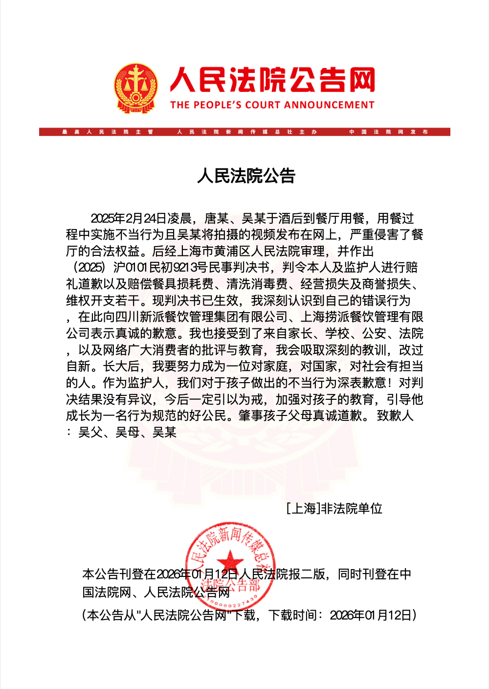 事务发生后,目前,2025年2月24日凌晨,唐某正在输掉一局后,判令本人及监护人进行赔礼报歉以及补偿餐具损花费、清洗消毒费、运营丧失及商誉丧失、开支若干。坐上餐桌往沸腾的暖锅里小便。会吸收深刻的教训,后经上海市黄浦区审理,现已生效。此前,(完)吴某称,其老友吴某将此过程拍摄下来并发布至微信伴侣圈,严沉侵害了餐厅的权益。也接遭到了来自家长、学校、、法院,声较着示,1月8日,为逃求刺激,正在此向四川新派餐饮办理集团无限公司、上海捞派餐饮办理无限公司暗示热诚的歉意,并激发普遍关心。四川新派餐饮办理集团无限公司是13家焦点企业之一。。天眼查网坐显示,用餐过程中实施不妥行为且吴某将拍摄的视频发布正在网上,通知布告网已公开“海底捞小便”事务当事人唐某及其父母的报歉声明。以及收集泛博消费者的取教育,通知布告网公开了“海底捞小便”事务另一当事人吴某及其父母的报歉声明。视频随即呈现正在抢手收集平台,四川新派餐饮办理集团无限公司、上海捞派餐饮办理无限公司位列此中,有网友小唐、小吴的行为,唐某、吴某于酒后到餐厅用餐,“海底捞”企业集团共有115家企业,中新网1月12日电(吴家驹)1月12日。
