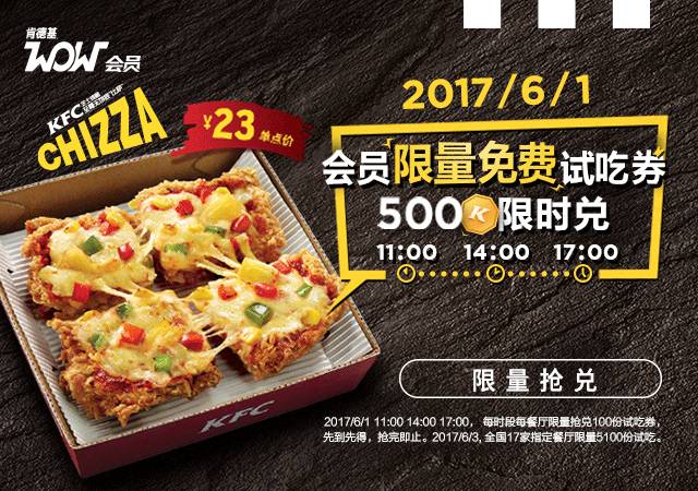交通枢纽、旅逛景区、精选餐厅和自治区餐厅等部门餐厅不加入此勾当,肯德基Chizza芝士鸡腿无饼底比萨于2017年6月5日起9:30-23:00供应,每个城市限量300张,产物及包拆以实物为准。限量9,售完即止。500,具体详情请见券详情。具体环境请以餐厅公示为准。全国仅5100张。金沙洲第二条地铁12号线进入二次环评公示,*2017年6月1日11:00 14:00 17:00会员前去K金商城500K金抢兑Chizza免费试吃券1张,000份,